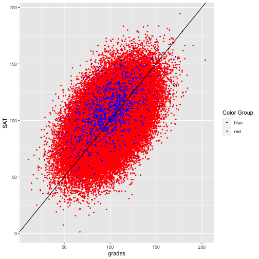 • there is no bias baked into the grading or the exams: both the Reds and the Blues also have exactly the same grade and exam score distributions